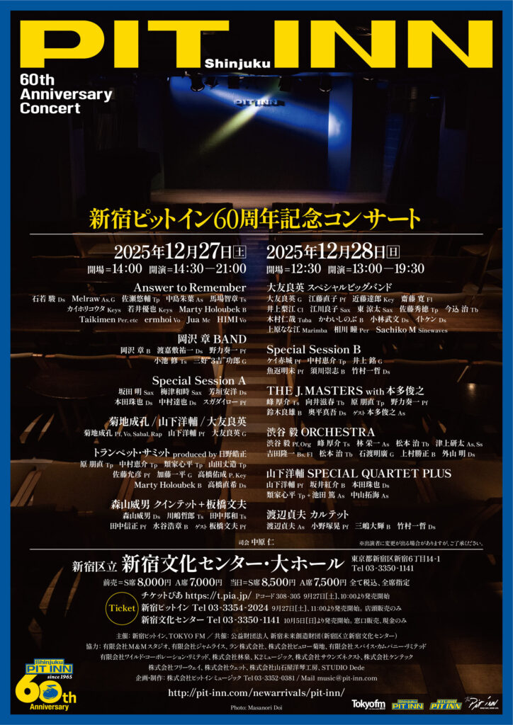 | 28 | 日 | 新宿文化センター Pit Inn 60周年記念コンサート J. Masters Live | 峰 厚介 (ts) 向井滋春 (tb) 原朋直 (tp) 鈴木良雄 (b) 奥平真吾 (ds) Guest 本多俊之 (as.ss) |